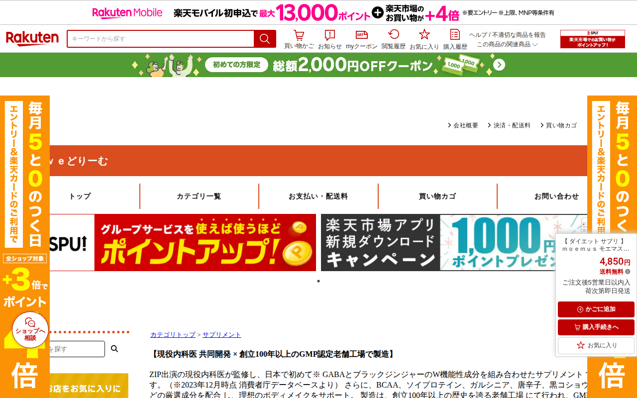このページは、楽天市場で販売されているダイエットサプリ「モエマス」の商品紹介ページです。現役内科医が監修し、GABA とブラックジンジャーの2つの機能性成分を組み合わせた日本初のサプリメントです。GABAは加齢に伴う筋肉...