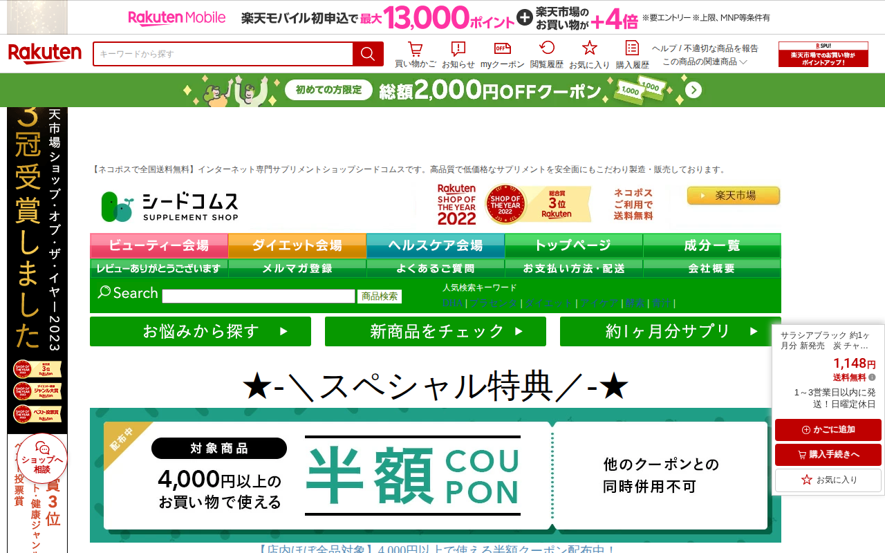 このページは、楽天市場のシードコムス店で販売されている「サラシアブラック」というダイエットサプリメントの商品ページです。約1ヶ月分(60粒)が1,148円で、送料無料です。サラシア末と複数の炭(竹炭、赤松炭、ヤシ殻炭)を...
