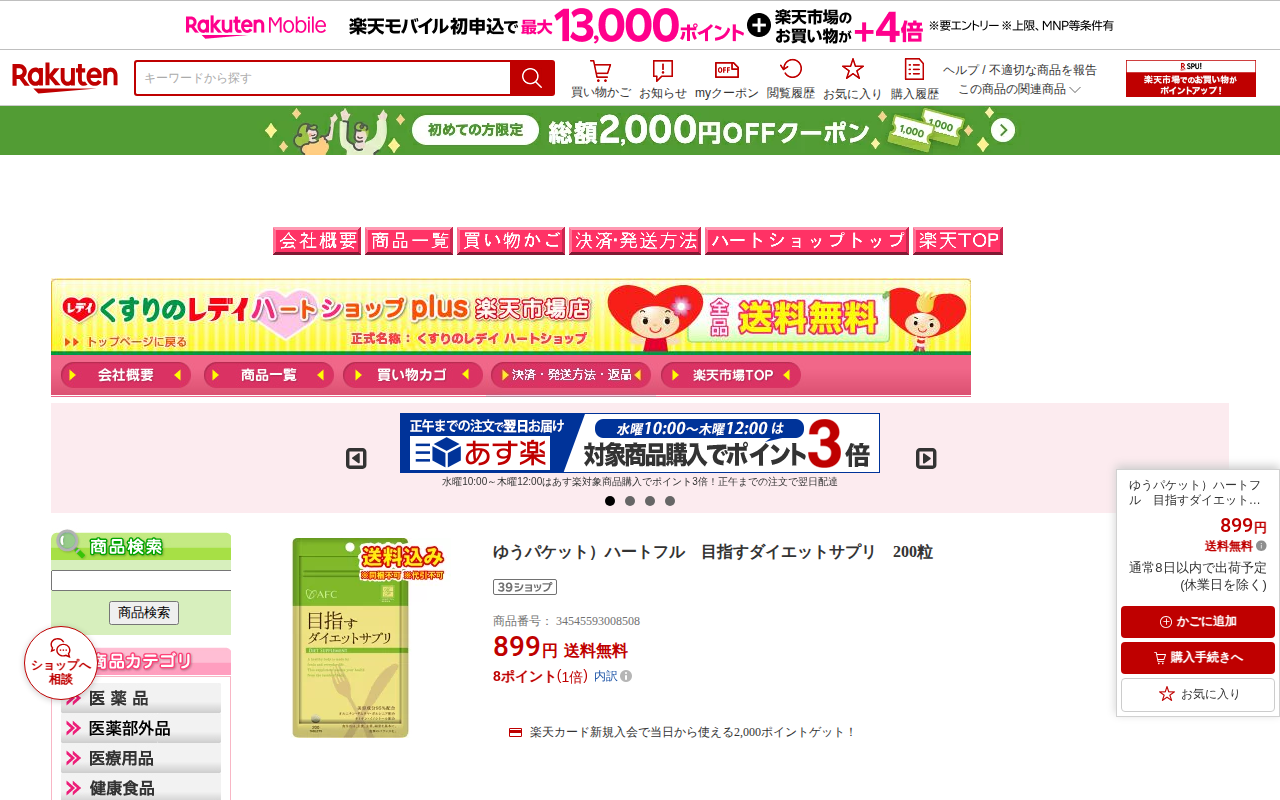このページは、楽天市場で販売されている「ハートフル 目指すダイエットサプリ」の商品ページです。200粒入りで899円、送料無料です。2種類の食物繊維とギムネマ、ガルシニアを配合したサプリメントで、1日4~6粒を目安に摂取...
