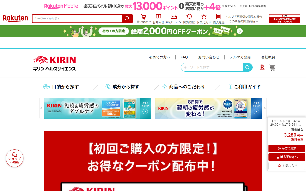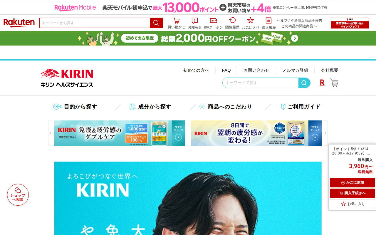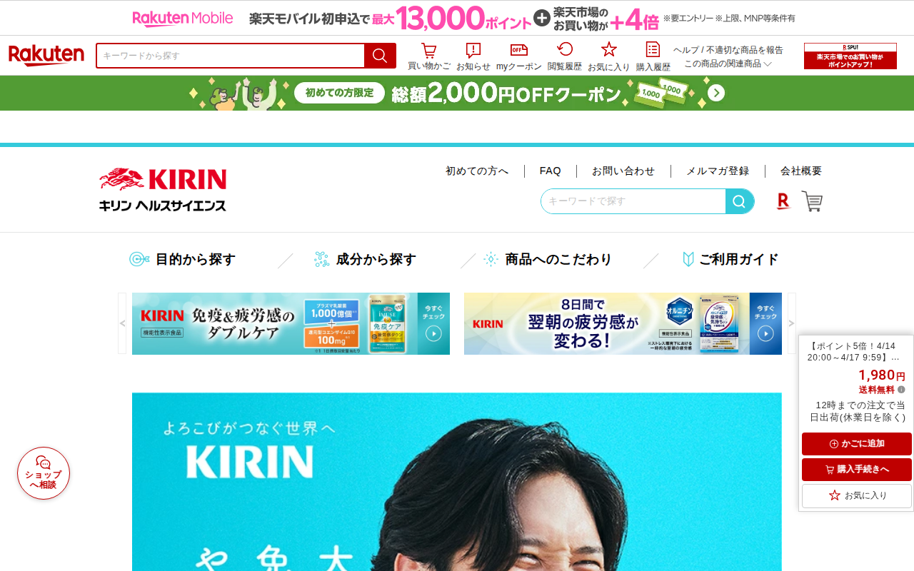 このページは、楽天市場でキリンの「iMUSE(イミューズ)免疫ケアサプリメント」を販売する商品ページです。プラズマ乳酸菌1000億個を含む機能性表示食品で、約15日分(60粒)が1,980円で送料無料。4月14日~17日...