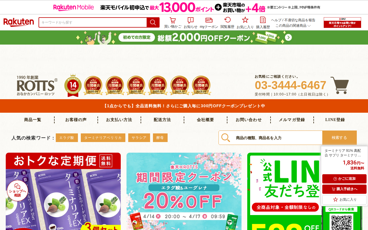 このページは、楽天市場で販売されているROTTS公式のダイエットサプリメント「コレファイン」の商品ページです。エラグ酸132mg配合(1粒)で、1袋30粒分あります。ザクロ抽出物、アフリカマンゴノキエキス、ブラックジンジ...