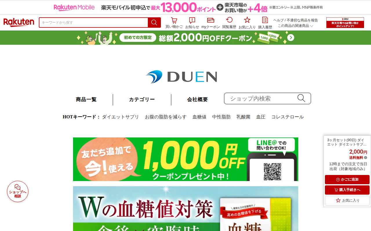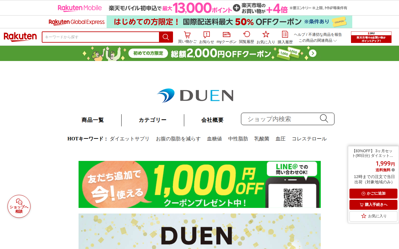 このページは、楽天市場で販売されているDUEN SHOPの乳酸菌サプリメントの商品ページです。有胞子性乳酸菌、ビフィズス菌、酪酸菌、食物繊維を配合した腸活サプリで、便通改善とダイエット効果が期待できます。30日分で通常価...