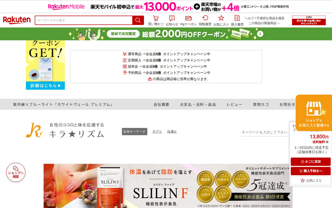 このページは、楽天市場で販売されているダイエットサプリメント「スリリン ファイア」の商品ページです。1袋90粒入りで、通常価格5,300円(送料無料)、現在5%OFF+ポイント5倍キャンペーン中です。定期購入なら15%割...