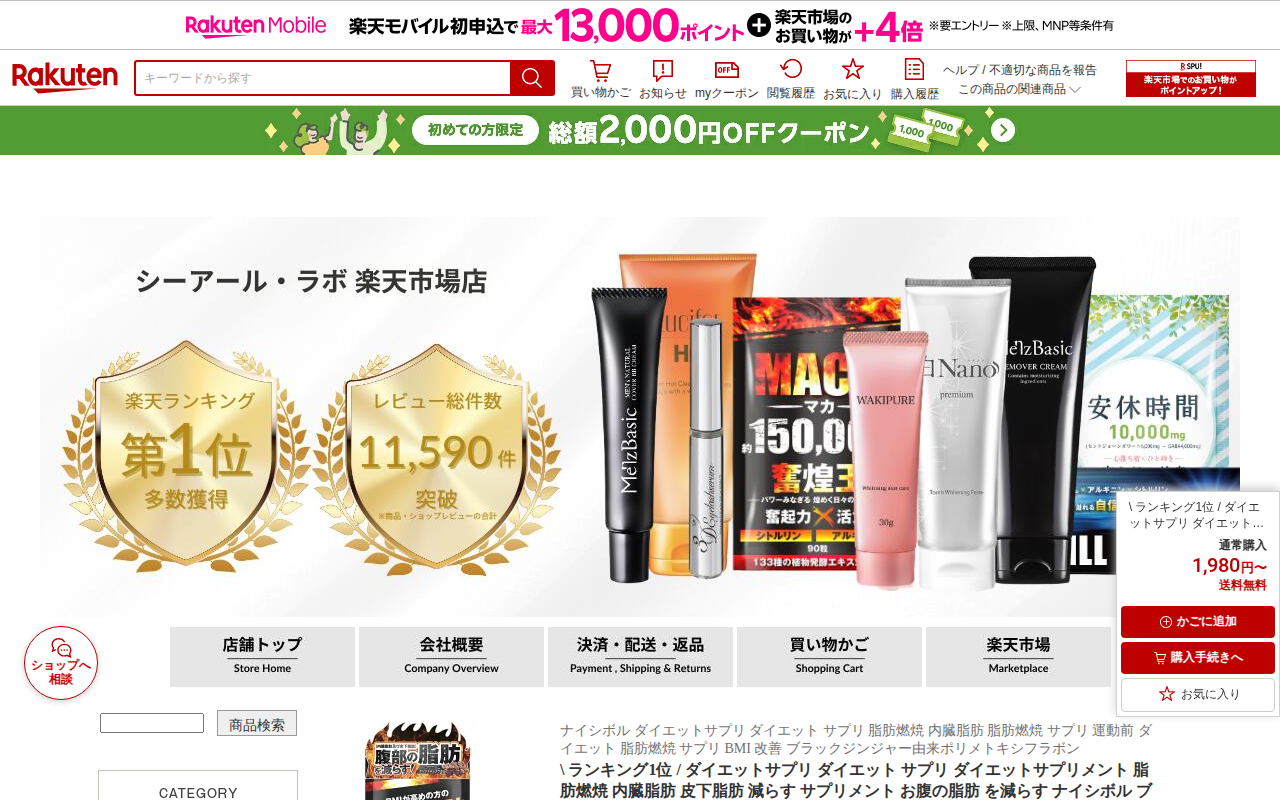 このページは、楽天市場で販売されている「ホットバーン」というダイエットサプリメントの商品ページです。ガルシニア、ブラックジンジャー、エラグ酸などの燃焼成分と、カルニチン、コエンザイムQ10、αリポ酸などの運動サポート成分...