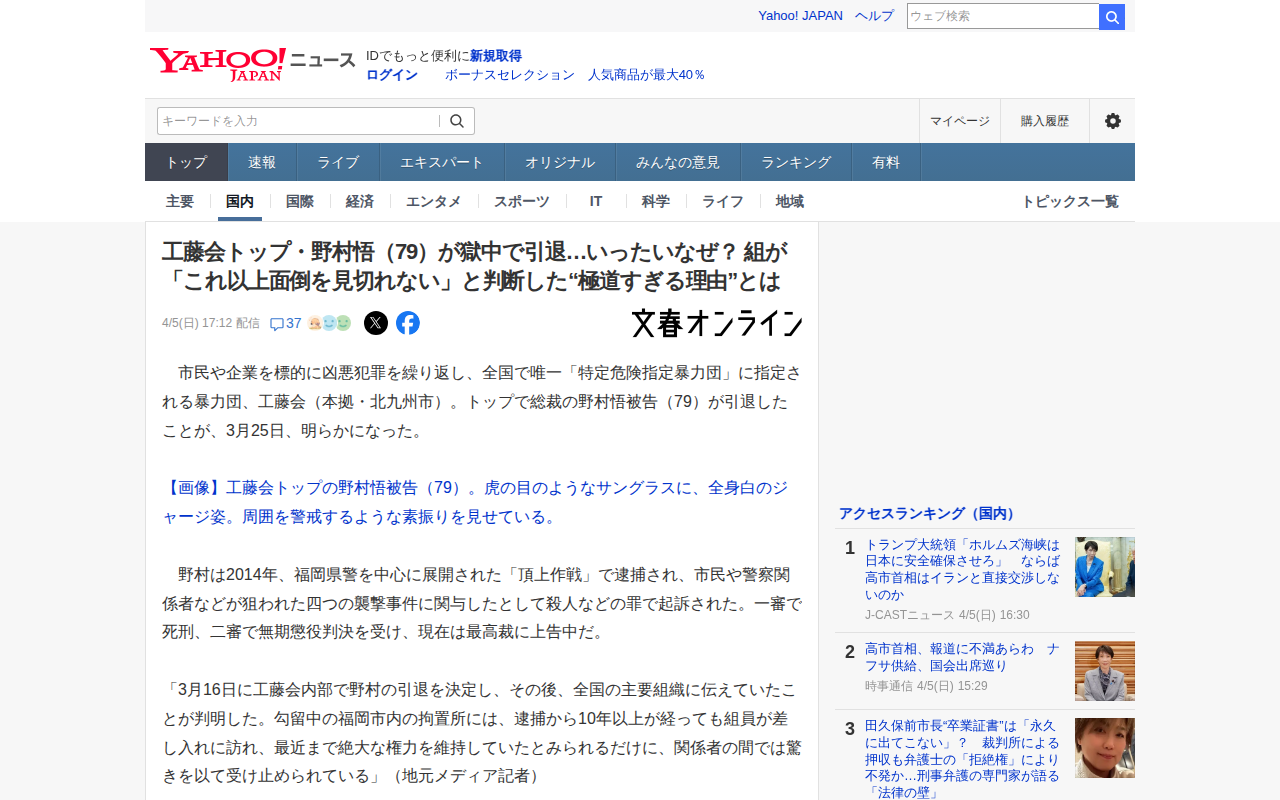 工藤会トップ・野村悟(79)が獄中で引退…いったいなぜ? 組が「これ以上面倒を見切れない」と判断した“極道すぎる理由”とは(文春オンライン) - Yahoo!ニュース