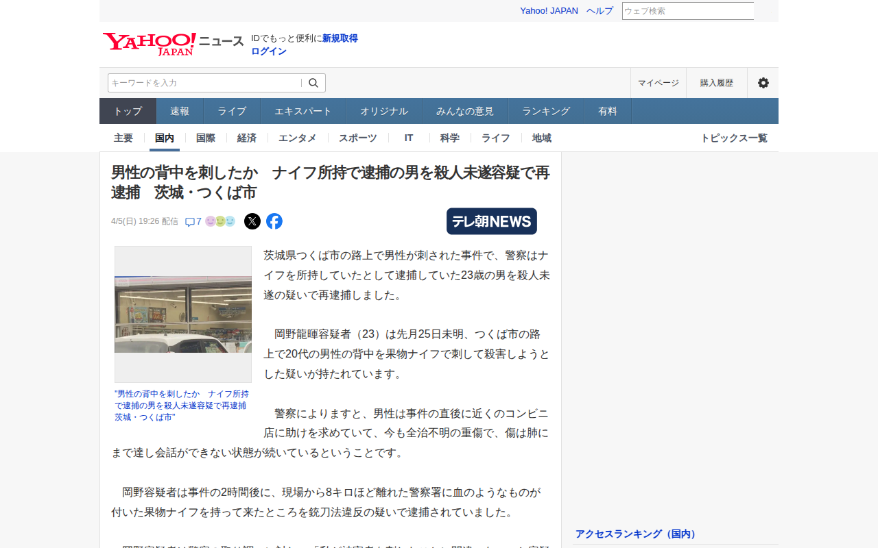 このページは、茨城県つくば市で男性が背中を刺された事件に関する記事です。ナイフ所持で逮捕されていた23歳の男・岡野龍暉容疑者が、殺人未遂容疑で再逮捕されました。先月25日未明、被害者の20代男性の背中を果物ナイフで刺し、...