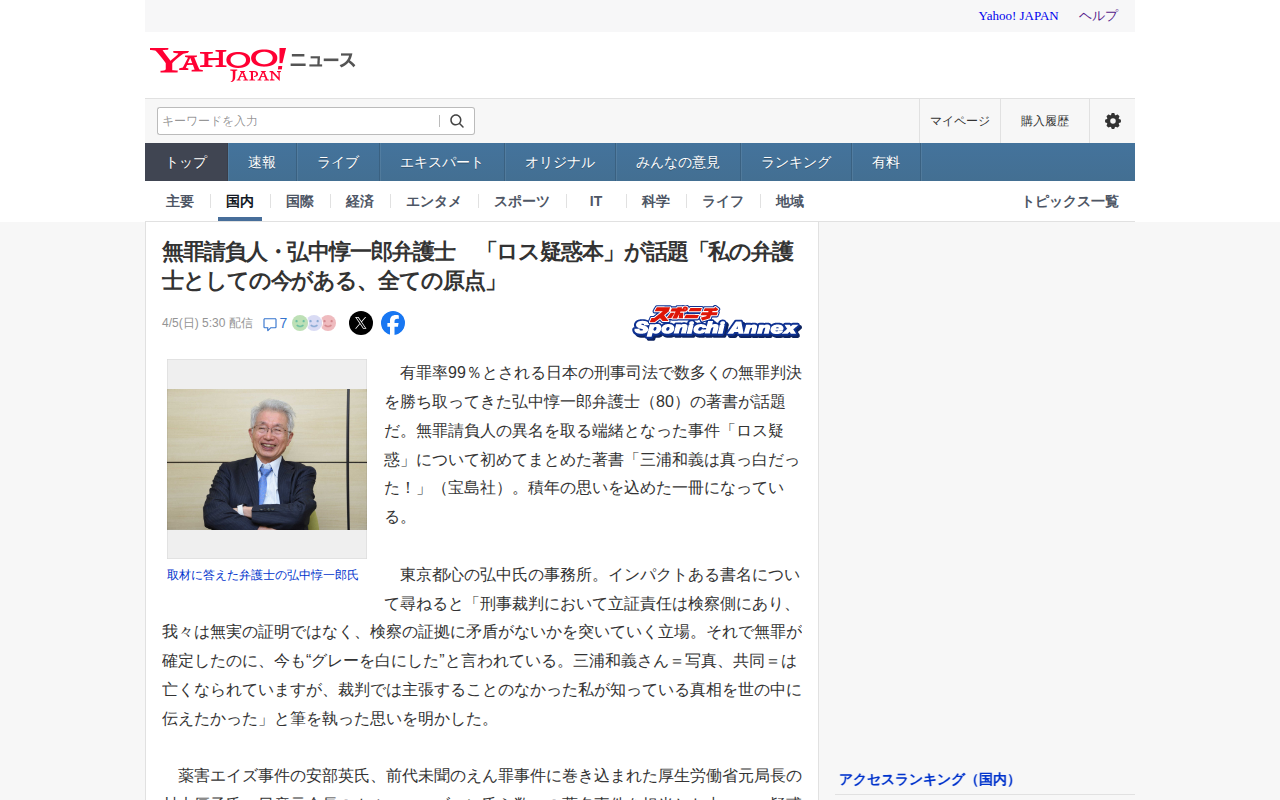 無罪請負人・弘中惇一郎弁護士 「ロス疑惑本」が話題「私の弁護士としての今がある、全ての原点」(スポニチアネックス) - Yahoo!ニュース