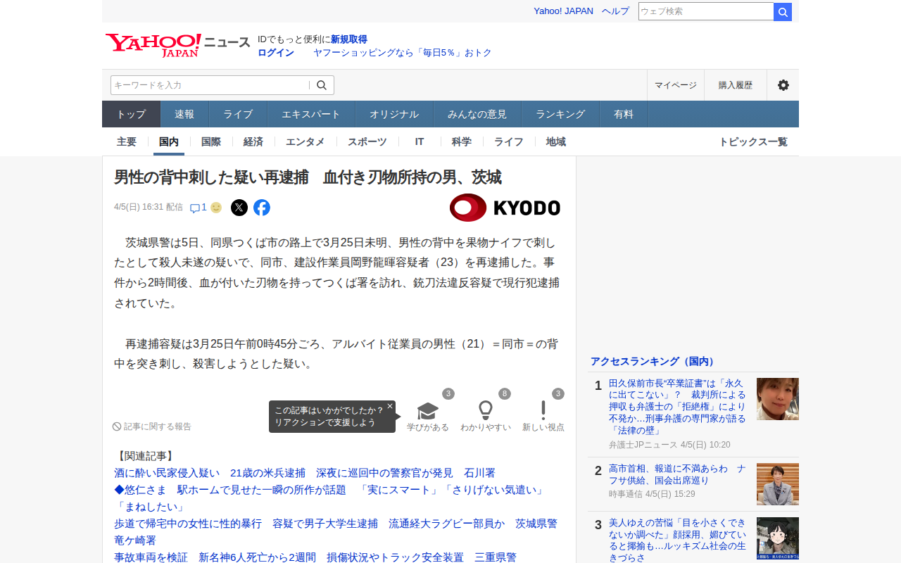 男性の背中刺した疑い再逮捕 血付き刃物所持の男、茨城(共同通信) - Yahoo!ニュース