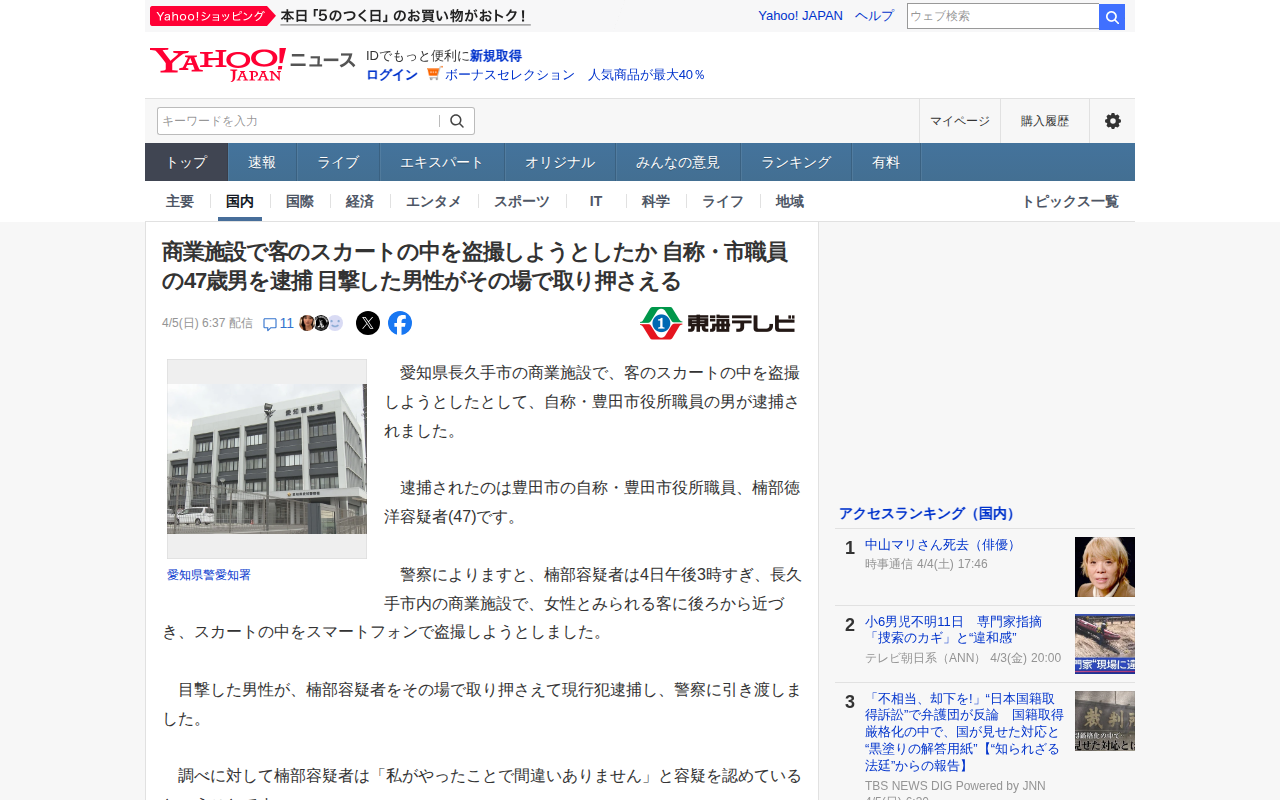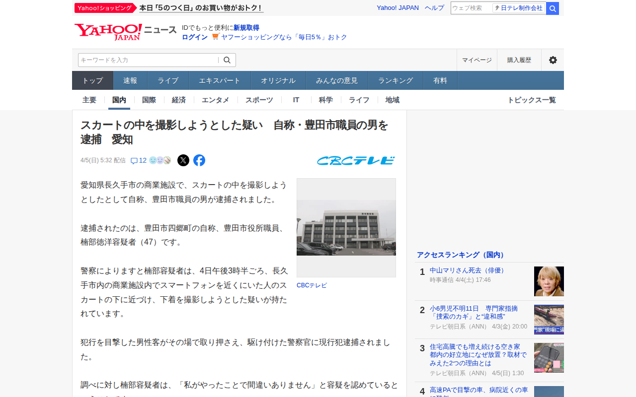 このページは、愛知県長久手市の商業施設で女性のスカートの中を撮影しようとしたとして、自称豊田市役所職員の楠部徳洋容疑者(47)が逮捕されたニュースを報じている。4月4日午後3時半ごろ、スマートフォンを女性のスカートの下に...