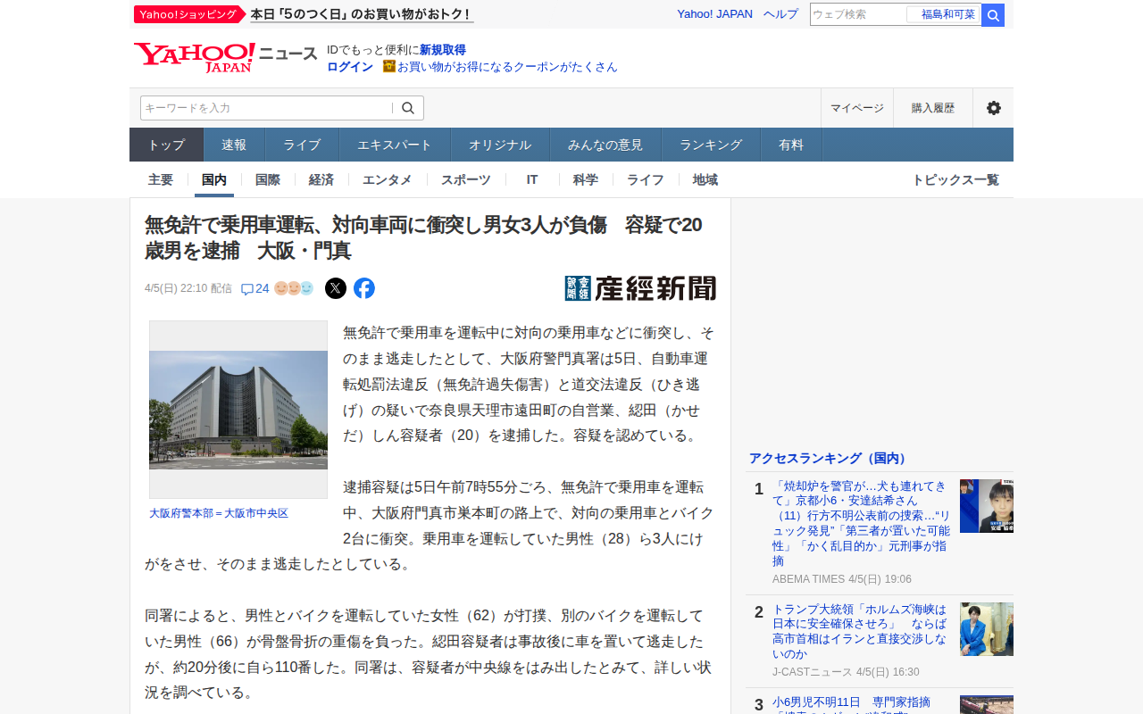 無免許で乗用車運転、対向車両に衝突し男女3人が負傷 容疑で20歳男を逮捕 大阪・門真(産経新聞) - Yahoo!ニュース