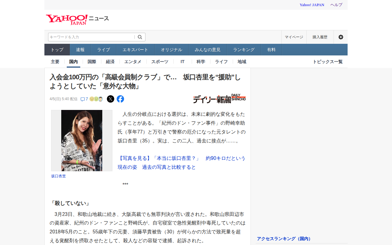 このページは、紀州のドン・ファンこと野崎幸助氏の死亡事件と元タレント坂口杏里の万引き逮捕事件を報じています。野崎氏は2018年5月に覚醒剤中毒死し、妻の須藤早貴被告が逮捕されましたが、2024年3月の大阪高裁で無罪判決が...