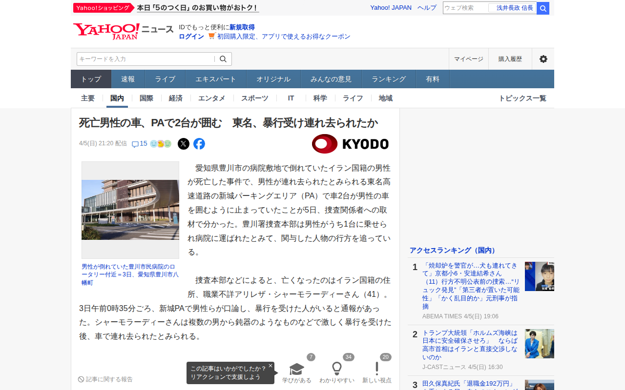 このページは、愛知県豊川市の病院敷地で倒れていたイラン国籍の男性アリレザ・シャーモラーディーさん(41)の死亡事件を報じている。男性は東名高速道路の新城パーキングエリアで複数の男から鈍器で暴行を受けた後、車で連れ去られた...