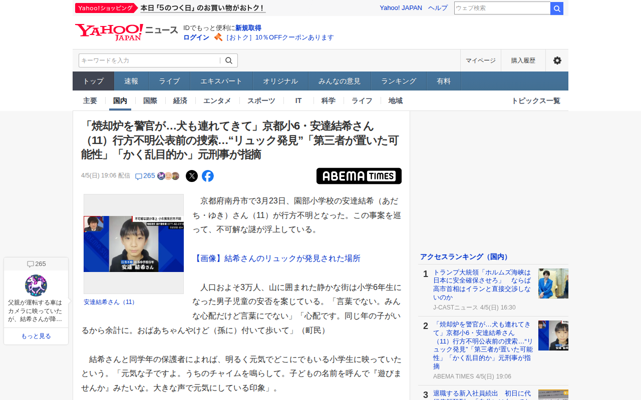 「焼却炉を警官が…犬も連れてきて」京都小6・安達結希さん(11)行方不明公表前の捜索…“リュック発見”「第三者が置いた可能性」「かく乱目的か」元刑事が指摘(ABEMA TIMES) - Yahoo!ニュース