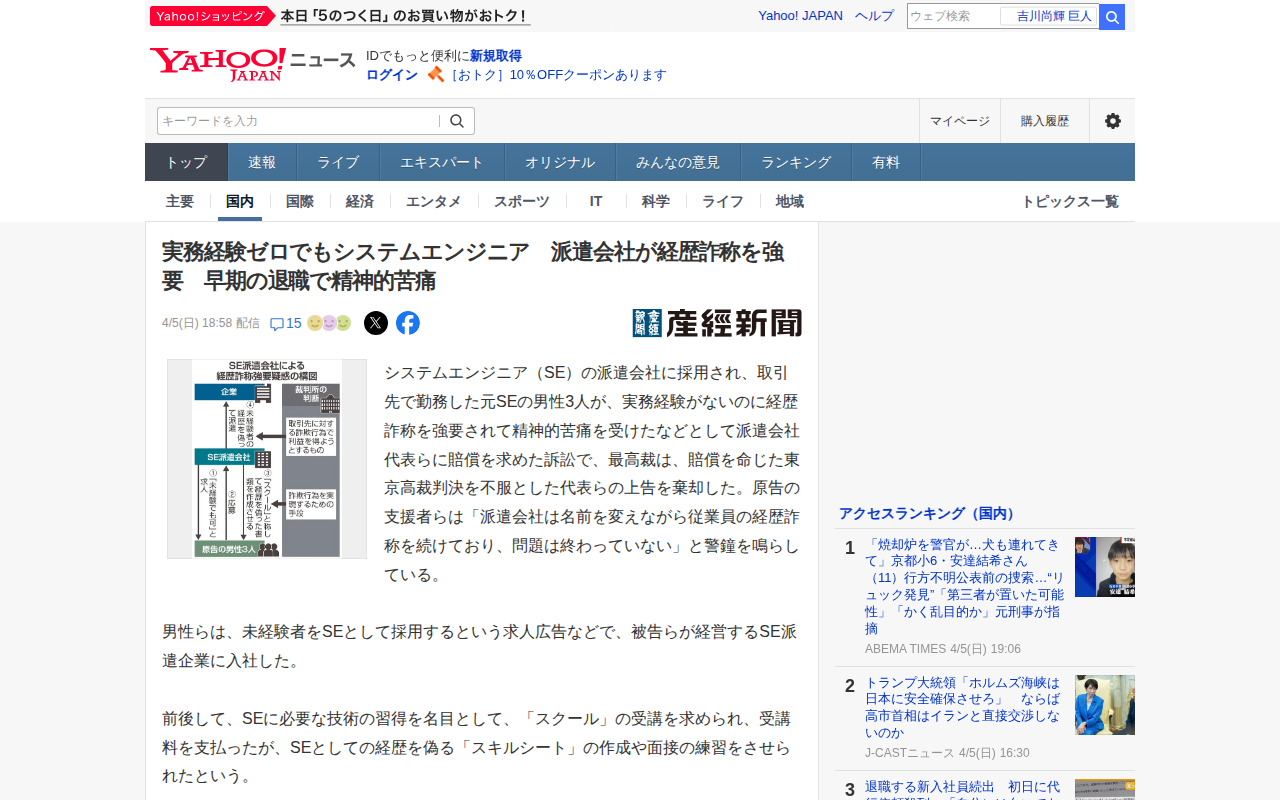 実務経験ゼロでもシステムエンジニア 派遣会社が経歴詐称を強要 早期の退職で精神的苦痛(産経新聞) - Yahoo!ニュース