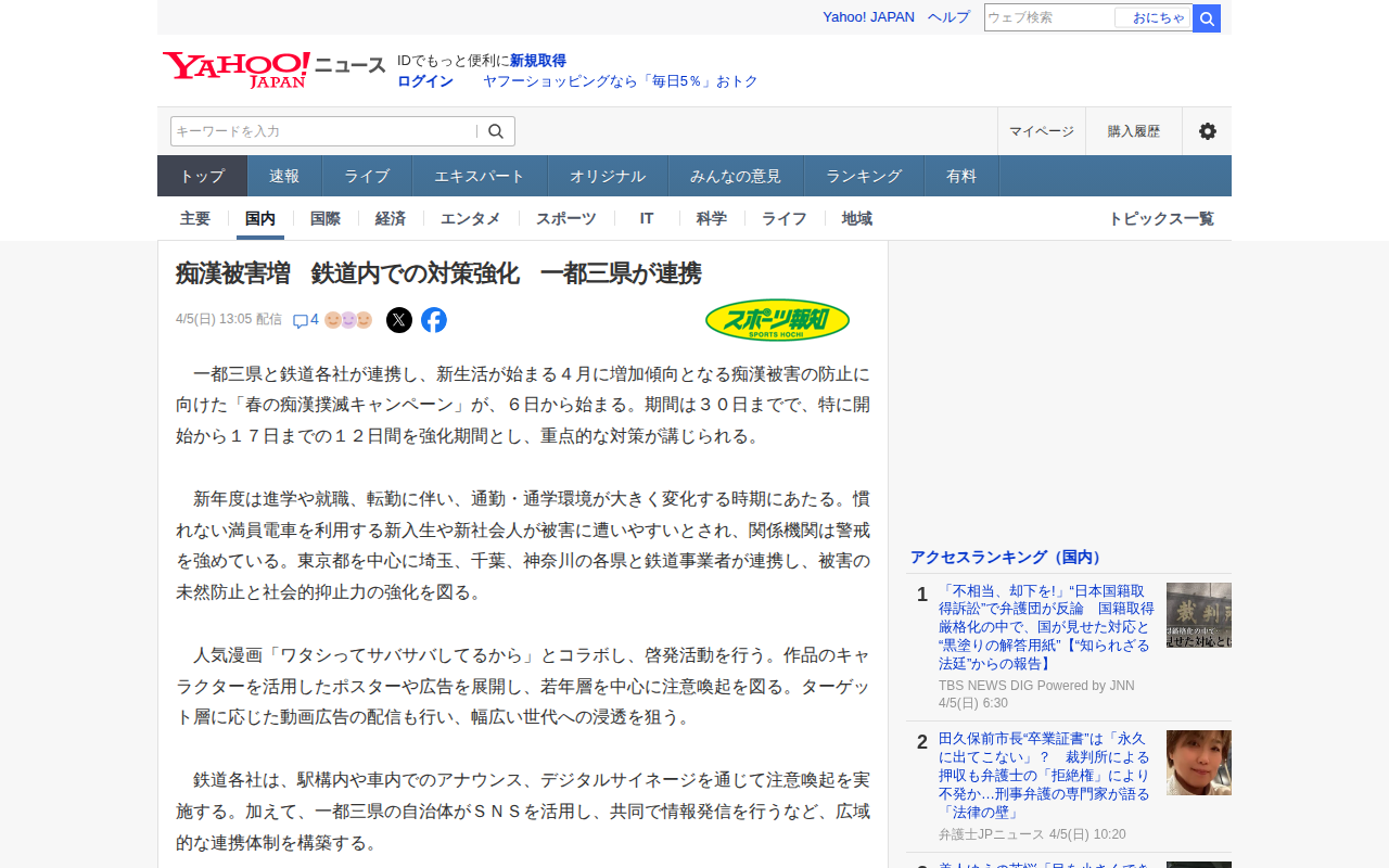 痴漢被害増 鉄道内での対策強化 一都三県が連携(スポーツ報知) - Yahoo!ニュース