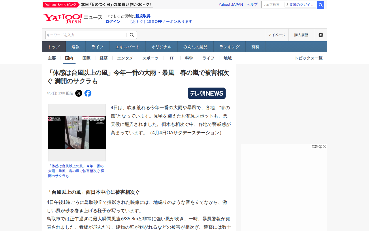 このページは、4月4日に日本列島を襲った春の嵐についての記事です。西日本を中心に今年一番の大雨と暴風がもたらされ、鳥取市では最大瞬間風速35.8mの非常に強い風が吹き、看板飛散や建物損壊など被害が相次ぎました。東京でも満...