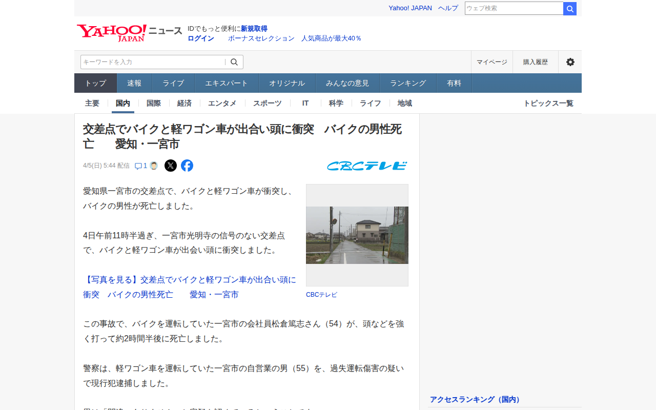 交差点でバイクと軽ワゴン車が出合い頭に衝突 バイクの男性死亡 愛知・一宮市(CBCテレビ) - Yahoo!ニュース