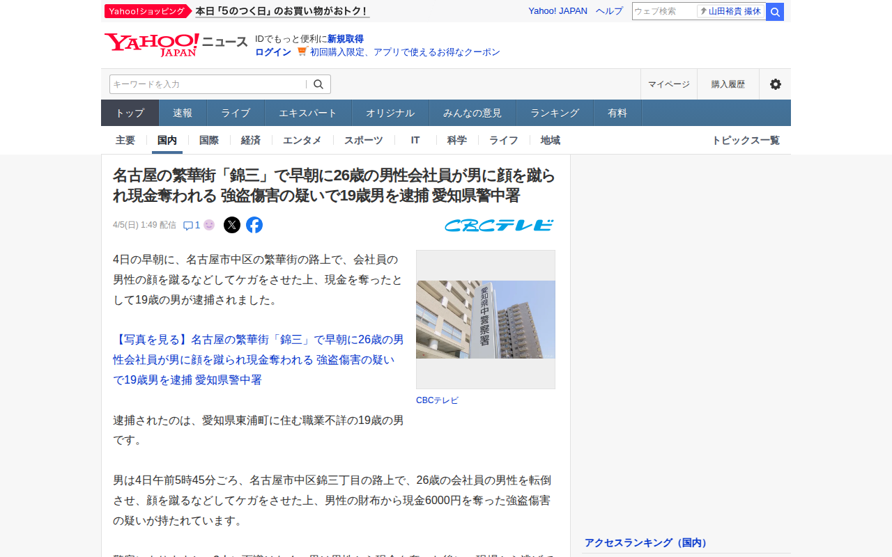 このページは、名古屋市中区の繁華街「錦三」で4日早朝に発生した強盗傷害事件を報じています。26歳の会社員男性が、面識のない19歳の男に顔を蹴られて転倒させられ、財布から現金6000円を奪われました。男は現場から逃走しまし...