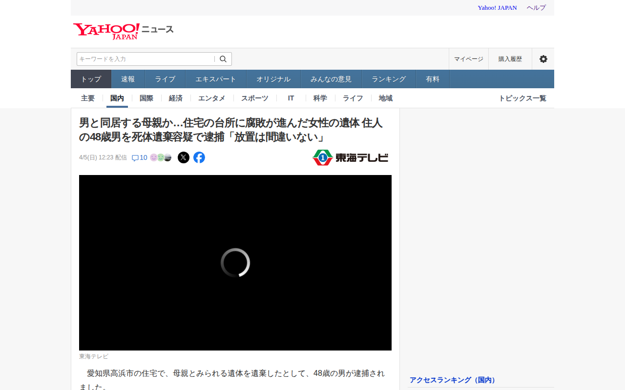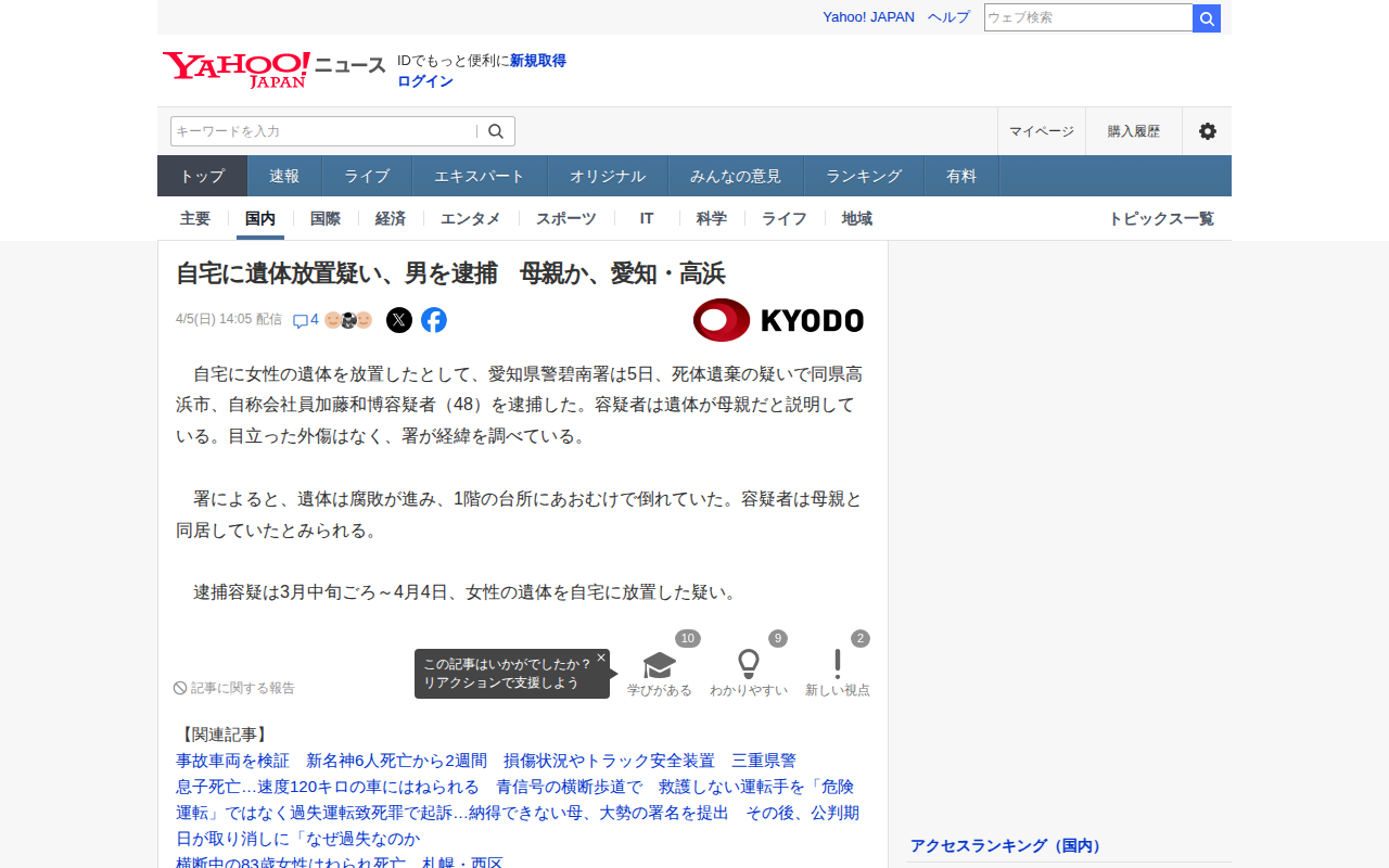 このページは、愛知県高浜市の住宅で母親とみられる腐敗した女性の遺体が発見され、同居する48歳の男が死体遺棄容疑で逮捕されたニュースを報じている。4月4日午後、「母親の意識と呼吸がない」との通報で警察が駆けつけ、1階の台所...