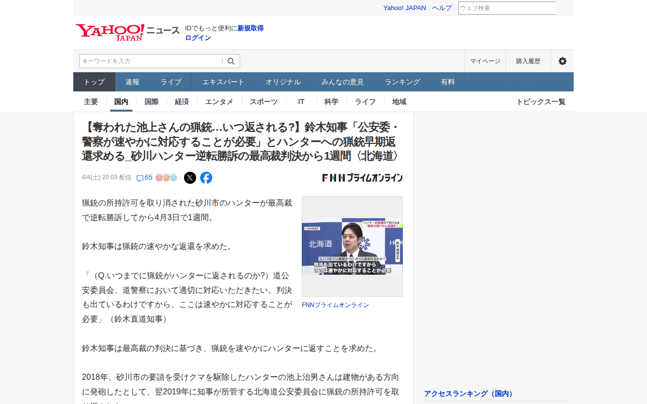 【奪われた池上さんの猟銃…いつ返される?】鈴木知事「公安委・警察が速やかに対応することが必要」とハンターへの猟銃早期返還求める_砂川ハンター逆転勝訴の最高裁判決から1週間〈北海道〉(FNNプライムオンライン) - Yahoo!ニュース