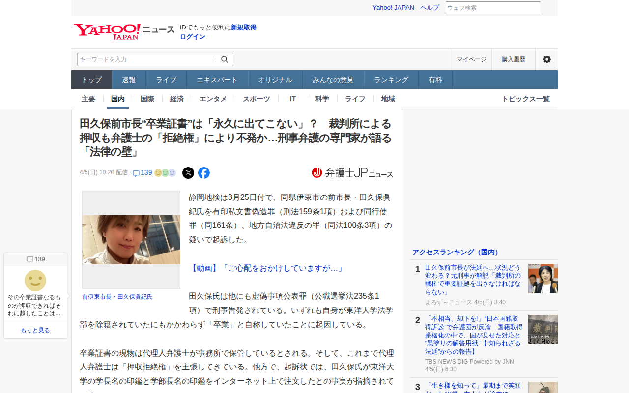 田久保前市長“卒業証書”は「永久に出てこない」? 裁判所による押収も弁護士の「拒絶権」により不発か…刑事弁護の専門家が語る「法律の壁」(弁護士JPニュース) - Yahoo!ニュース