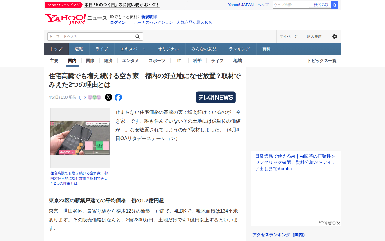 住宅高騰でも増え続ける空き家 都内の好立地になぜ放置?取材でみえた2つの理由とは(テレビ朝日系(ANN)) - Yahoo!ニュース