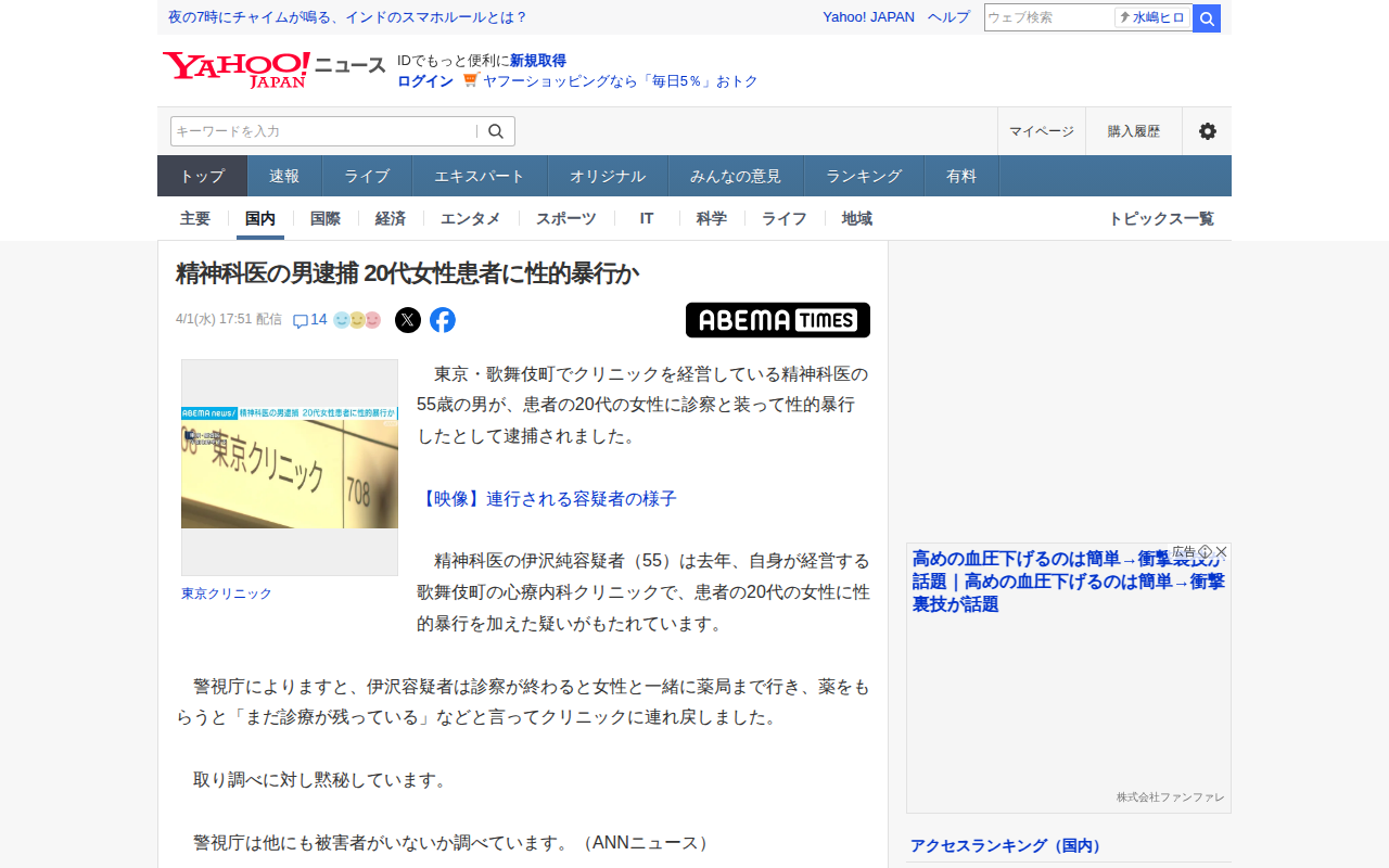 精神科医の男逮捕 20代女性患者に性的暴行か(ABEMA TIMES) - Yahoo!ニュース