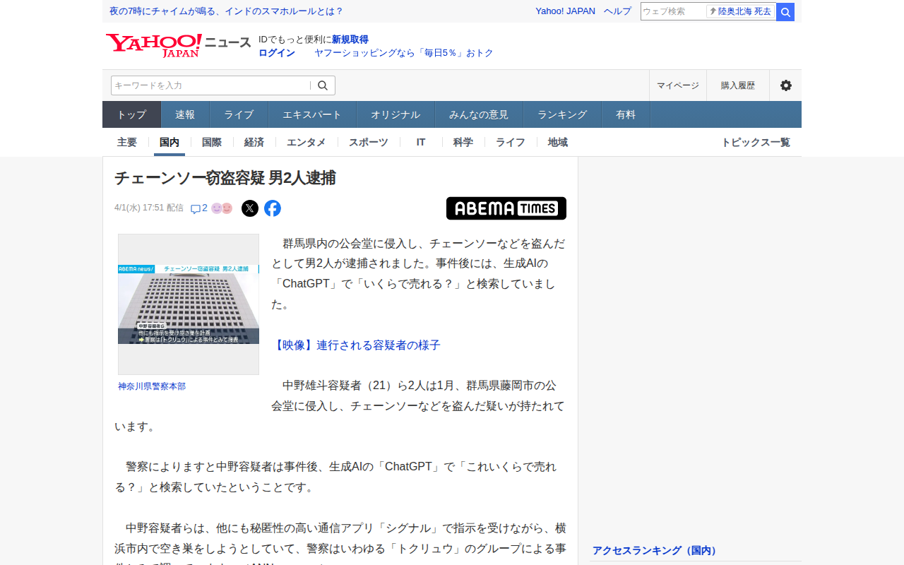 このページは、群馬県藤岡市の公会堂からチェーンソーなどを盗んだとして、21歳の男2人が逮捕されたニュースを報じています。容疑者は盗難事件後、生成AI「ChatGPT」で「いくらで売れる?」と検索していました。警察によれば...