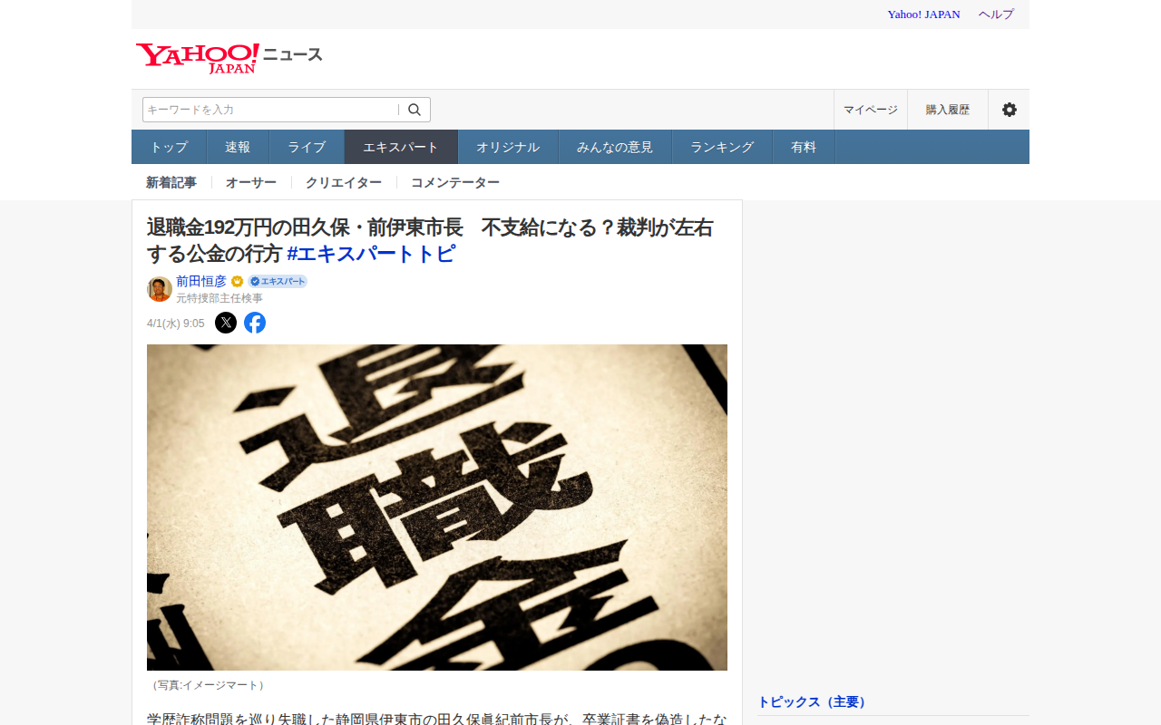 退職金192万円の田久保・前伊東市長 不支給になる?裁判が左右する公金の行方 #エキスパートトピ(前田恒彦) - エキスパート - Yahoo!ニュース