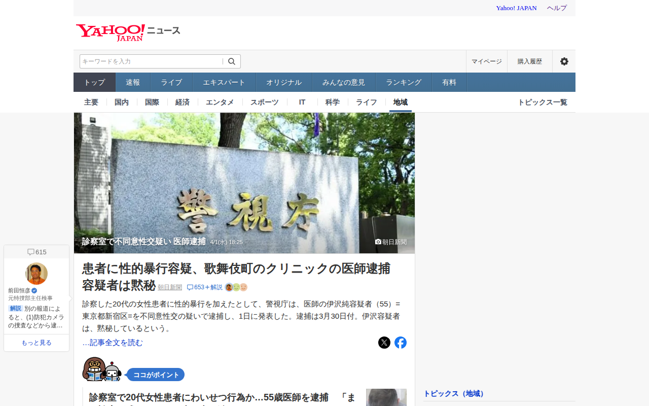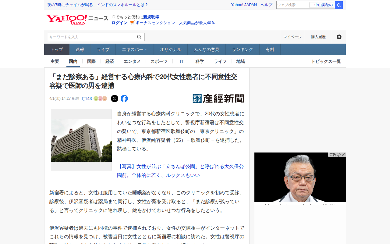 このページは、東京・歌舞伎町でクリニックを経営する精神科医・伊沢純容疑者(55)が、患者の20代女性に診察を装って性的暴行を加えた疑いで逮捕されたニュースを報じています。容疑者は診察後、薬局に同行した後、「診療が残ってい...