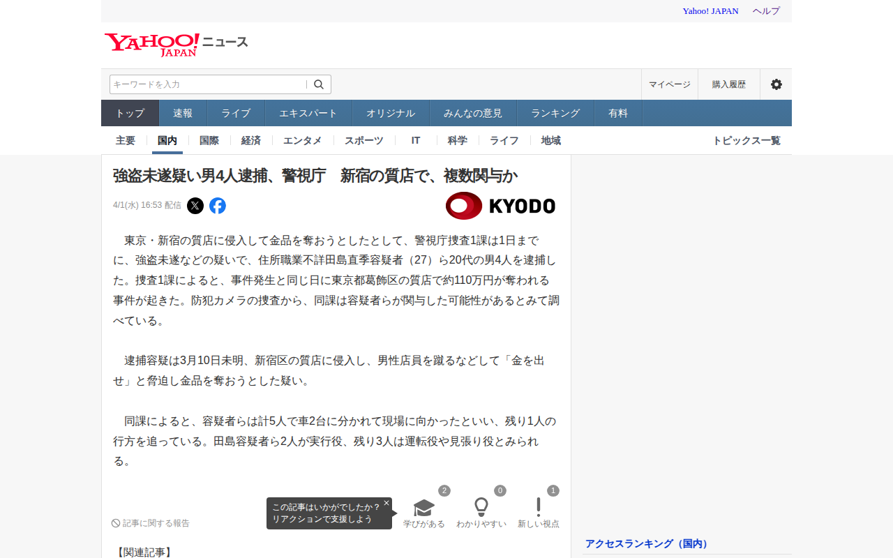 このページは、東京・新宿の質店への強盗未遂事件で警視庁が20代の男4人を逮捕したことを報じている。3月10日未明、容疑者らが質店に侵入し、男性店員を蹴るなどして金品を奪おうとした疑い。同日に葛飾区の質店で約110万円が奪...