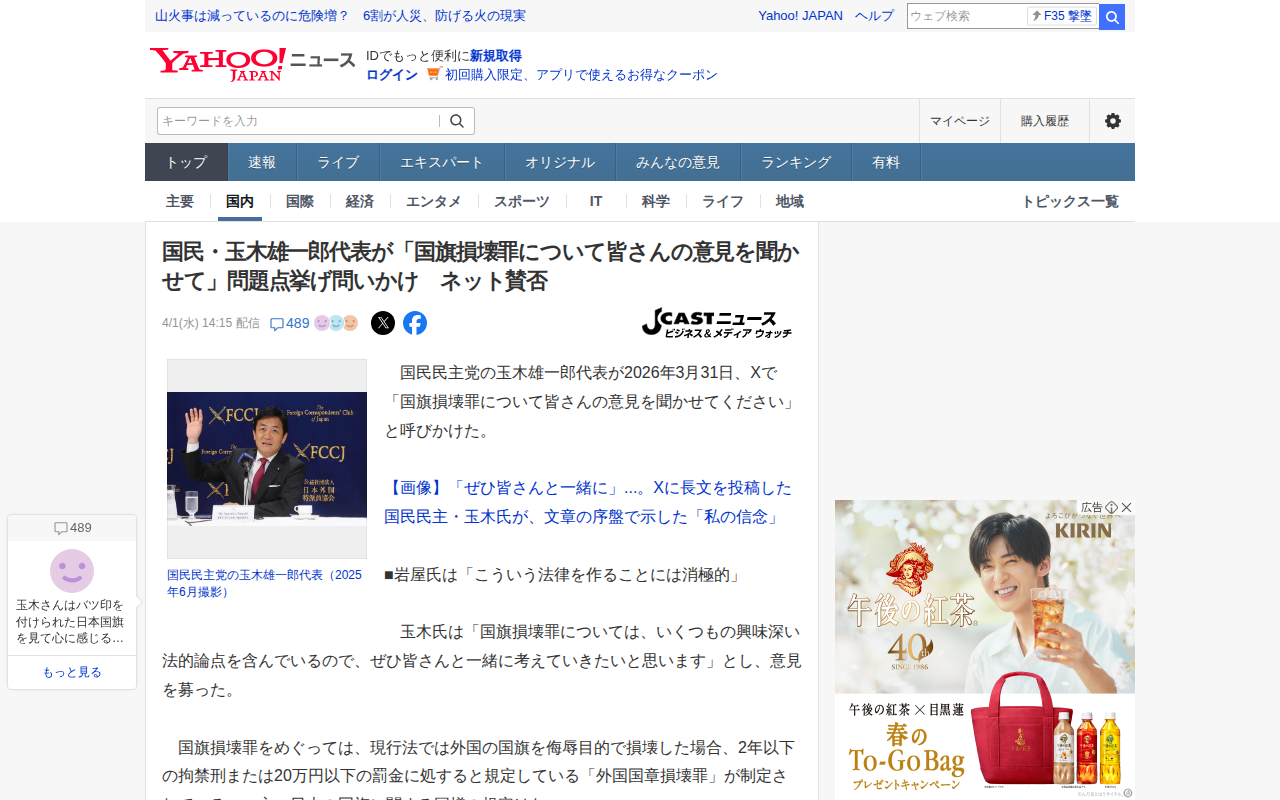 国民・玉木雄一郎代表が「国旗損壊罪について皆さんの意見を聞かせて」問題点挙げ問いかけ ネット賛否(J-CASTニュース) - Yahoo!ニュース