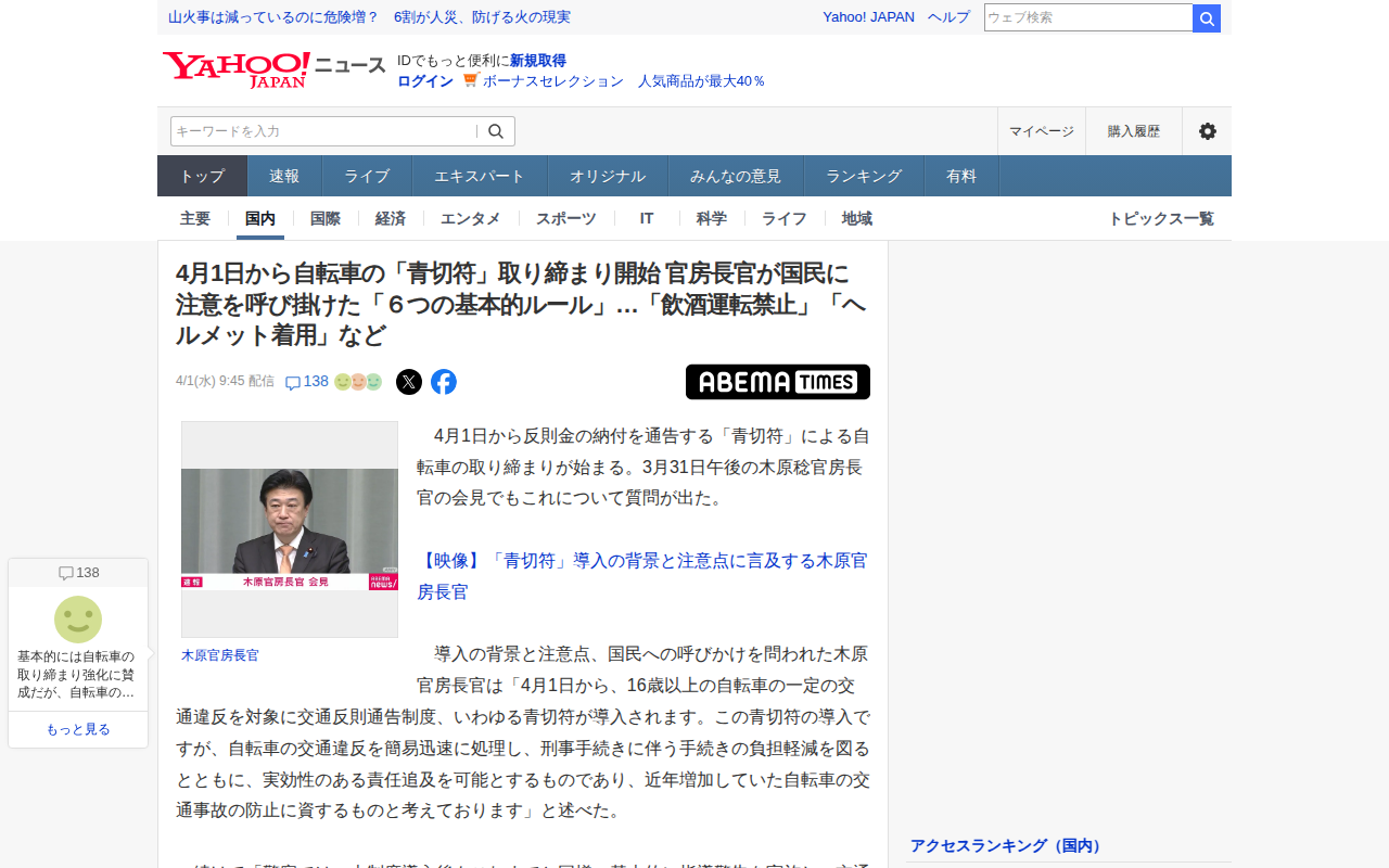 4月1日から自転車の「青切符」取り締まり開始 官房長官が国民に注意を呼び掛けた「6つの基本的ルール」…「飲酒運転禁止」「ヘルメット着用」など(ABEMA TIMES) - Yahoo!ニュース
