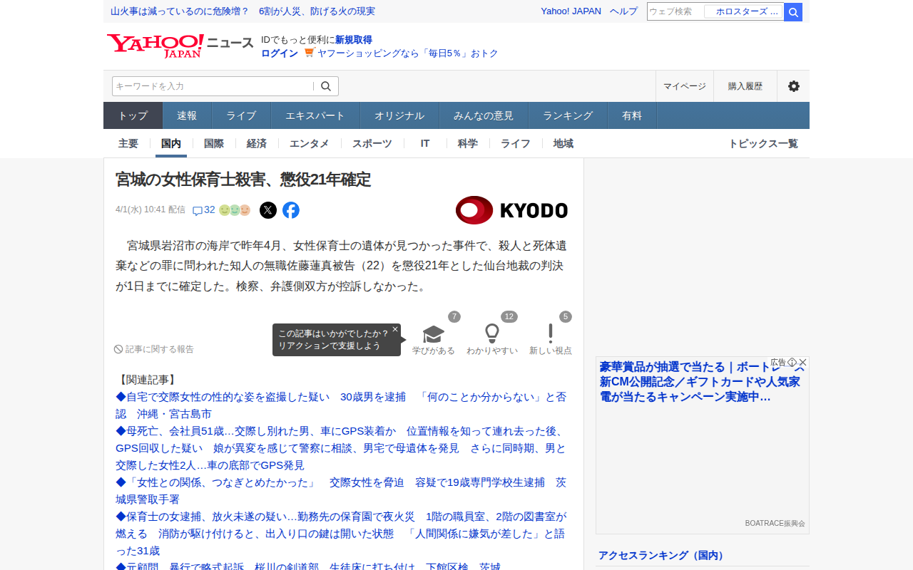 宮城の女性保育士殺害、懲役21年確定(共同通信) - Yahoo!ニュース