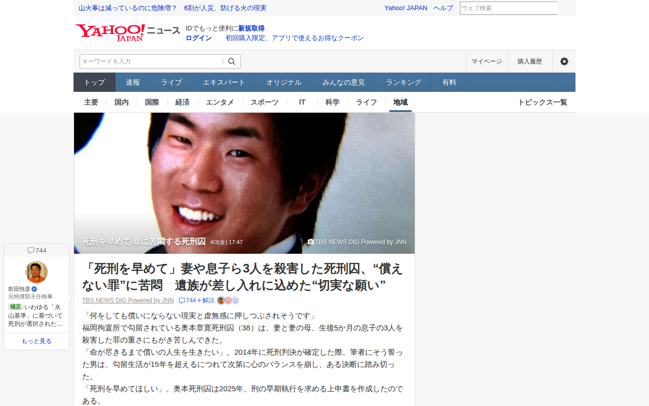 このページは、妻と妻の母、生後5か月の息子3人を殺害した罪で死刑囚となった奥本章寛受刑者(38)の現在を報じている。2014年に死刑判決が確定してから15年以上、償えない罪の重さに苦悩してきた奥本死刑囚が、2025年に刑...