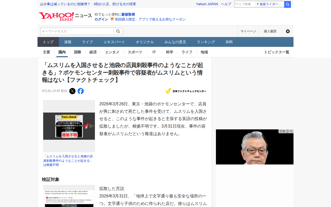 このページは、ポケモンセンター刺殺事件に関連して拡散した「ムスリムを入国させると危険な事件が起きる」という投稿のファクトチェック記事です。2026年3月26日に東京・池袋のポケモンセンターで発生した事件について、容疑者が...