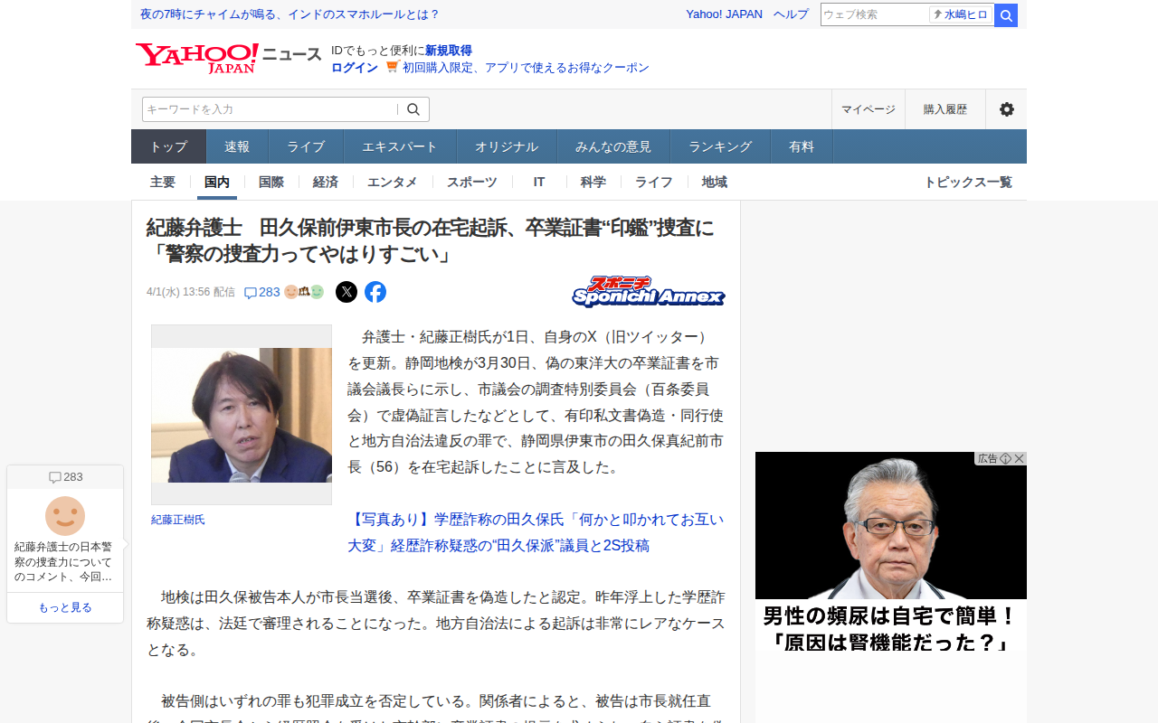 紀藤弁護士 田久保前伊東市長の在宅起訴、卒業証書“印鑑”捜査に「警察の捜査力ってやはりすごい」(スポニチアネックス) - Yahoo!ニュース