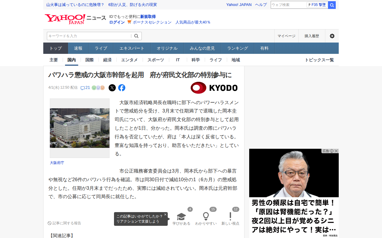 パワハラ懲戒の大阪市幹部を起用 府が府民文化部の特別参与に(共同通信) - Yahoo!ニュース
