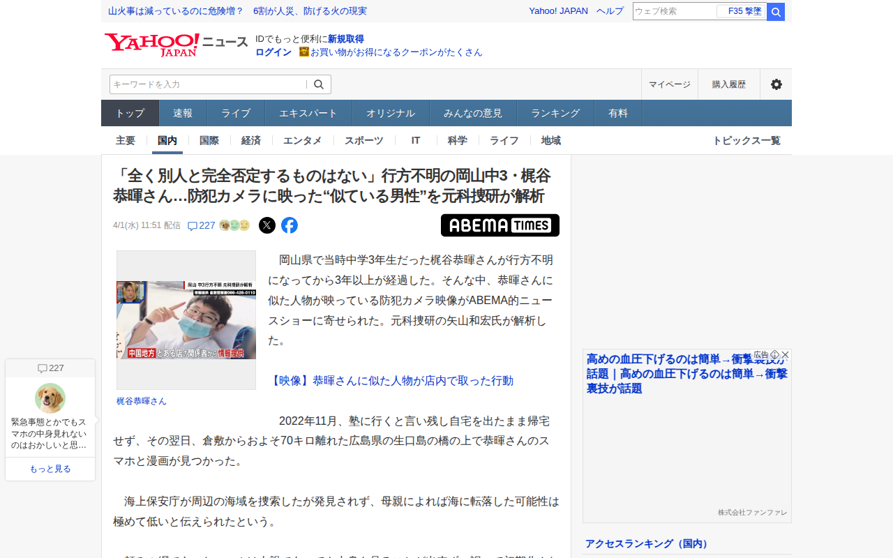 このページは、岡山県で2022年11月に行方不明になった中学3年生・梶谷恭暉さんについて、防犯カメラに映った彼に似た男性を元京都府警科捜研の矢山和宏氏が解析した記事である。矢山氏は顔の輪郭やメガネなど複数の特徴が非常に似...