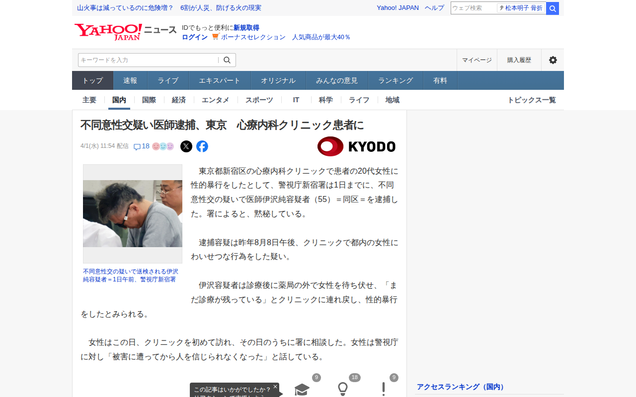 このページは、東京都新宿区の心療内科クリニックを経営する精神科医・伊沢純容疑者(55)が、20代女性患者に不同意性交の疑いで逮捕された事件を報じている。容疑者は診察後、患者が薬局で薬を受け取ると「まだ診察が残っている」と...