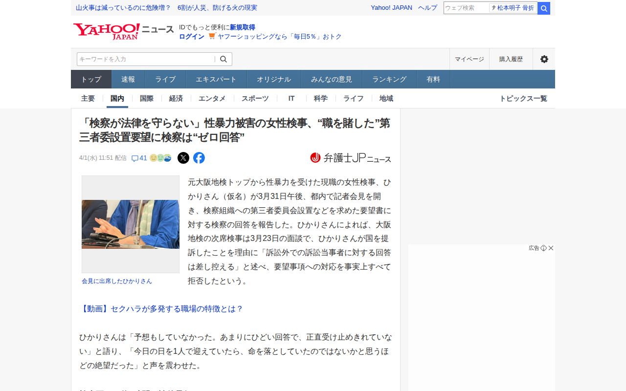 「検察が法律を守らない」性暴力被害の女性検事、“職を賭した”第三者委設置要望に検察は“ゼロ回答”(弁護士JPニュース) - Yahoo!ニュース