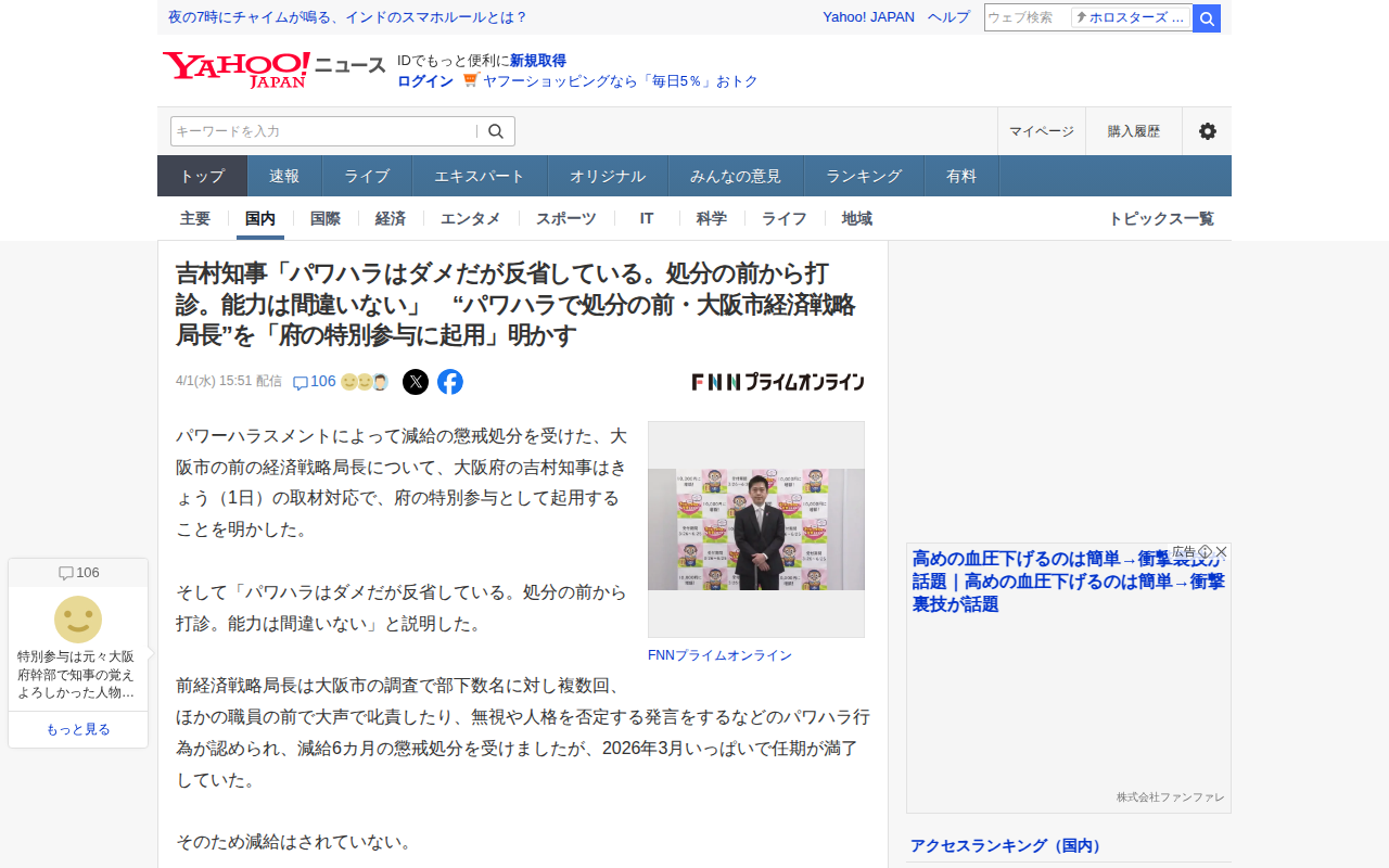 吉村知事「パワハラはダメだが反省している。処分の前から打診。能力は間違いない」 “パワハラで処分の前・大阪市経済戦略局長”を「府の特別参与に起用」明かす(FNNプライムオンライン) - Yahoo!ニュース
