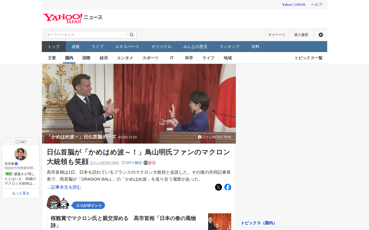 このページは、高市首相がフランスのマクロン大統領と会談した際のニュースを報じています。会談後の共同記者発表で、両首脳が漫画「DRAGON BALL」の「かめはめ波」のポーズを送り合う場面があったことが話題となっています。...