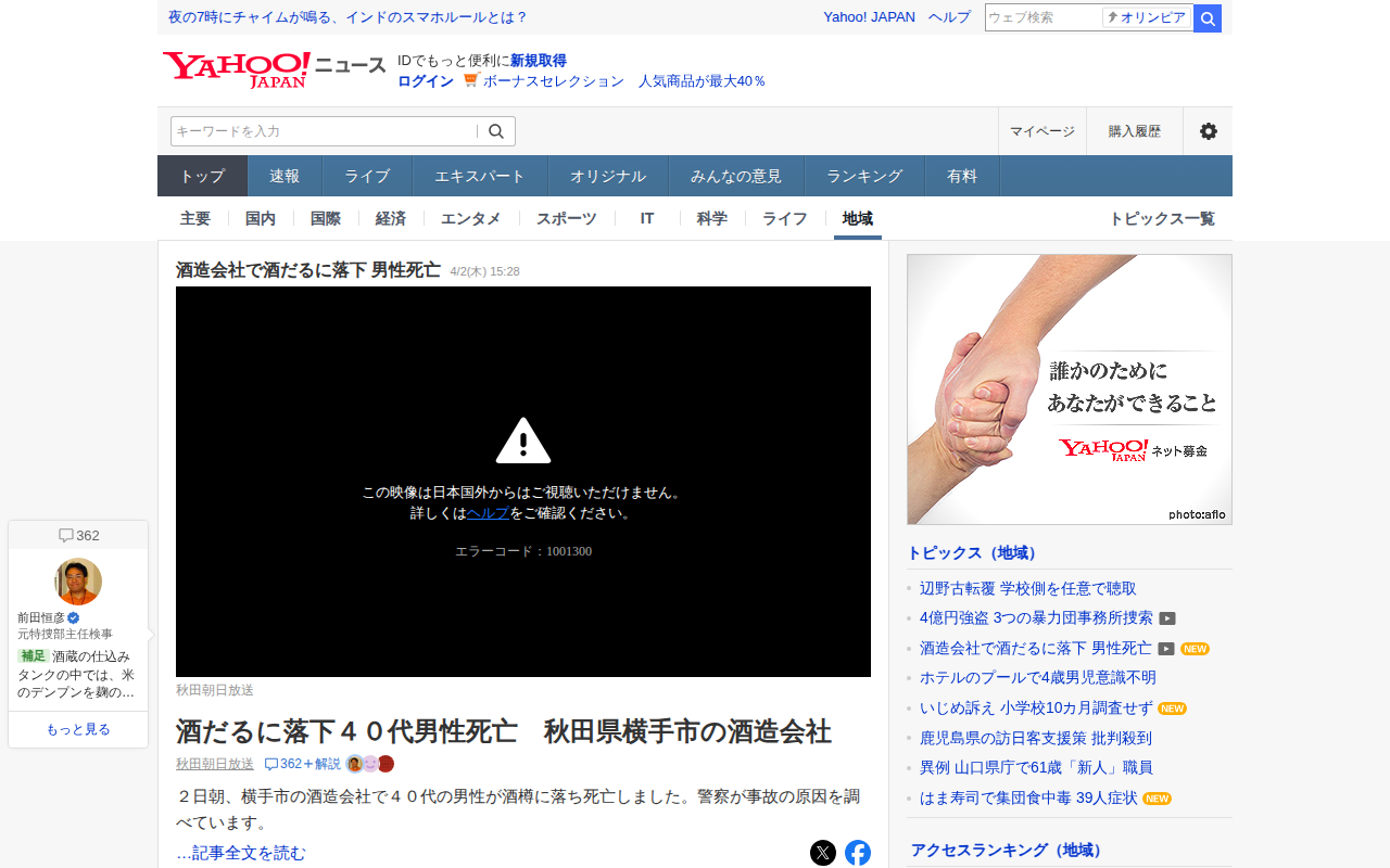 このページは、秋田県横手市の酒造会社で4月2日朝に発生した事故のニュースを報じています。40代の男性が酒樽に落下して死亡しました。警察が事故の原因を調査中です。記事にはコメント欄があり、酒造業界の安全対策の重要性について...