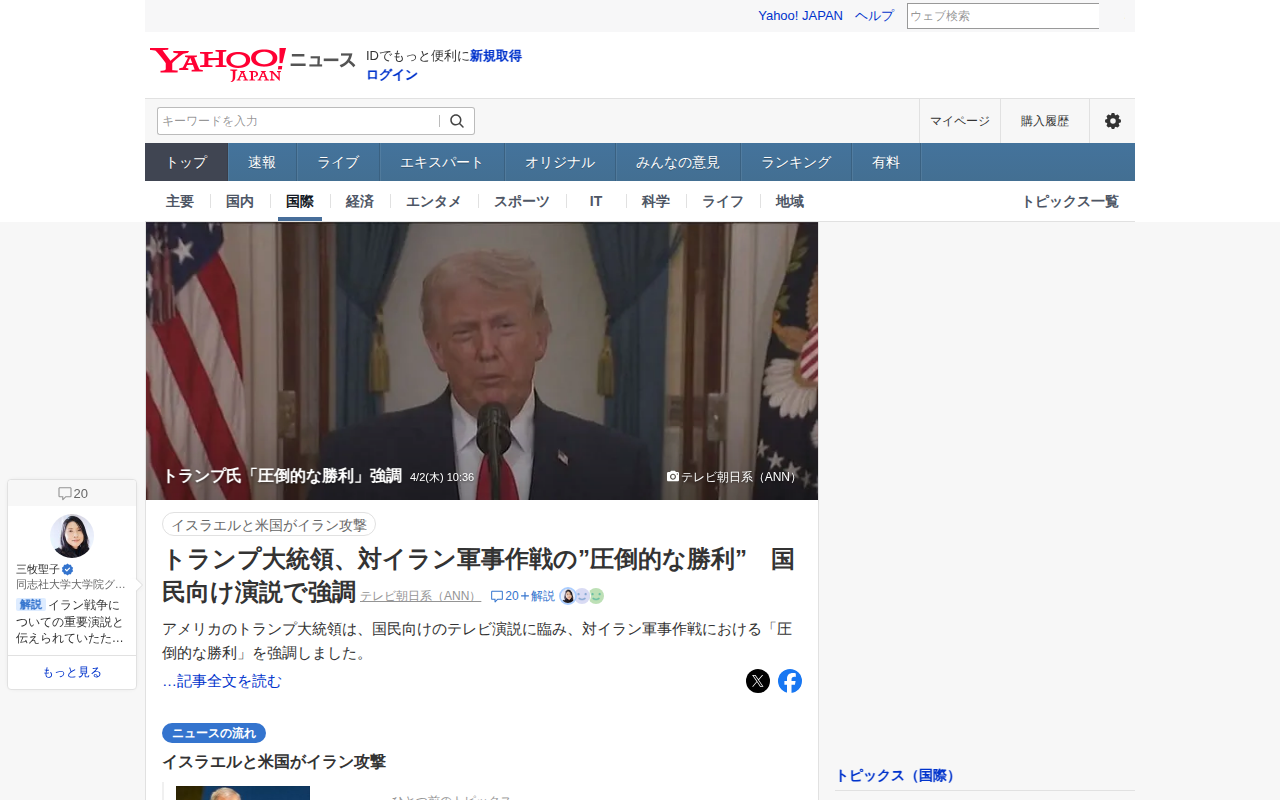 このページは、アメリカのトランプ大統領がイランに対する軍事作戦について国民向けテレビ演説で「圧倒的な勝利」を強調したことを報じています。演説では核心的な目標がほぼ完遂されたと述べられ、今後2~3週間で作戦が完了するとされ...