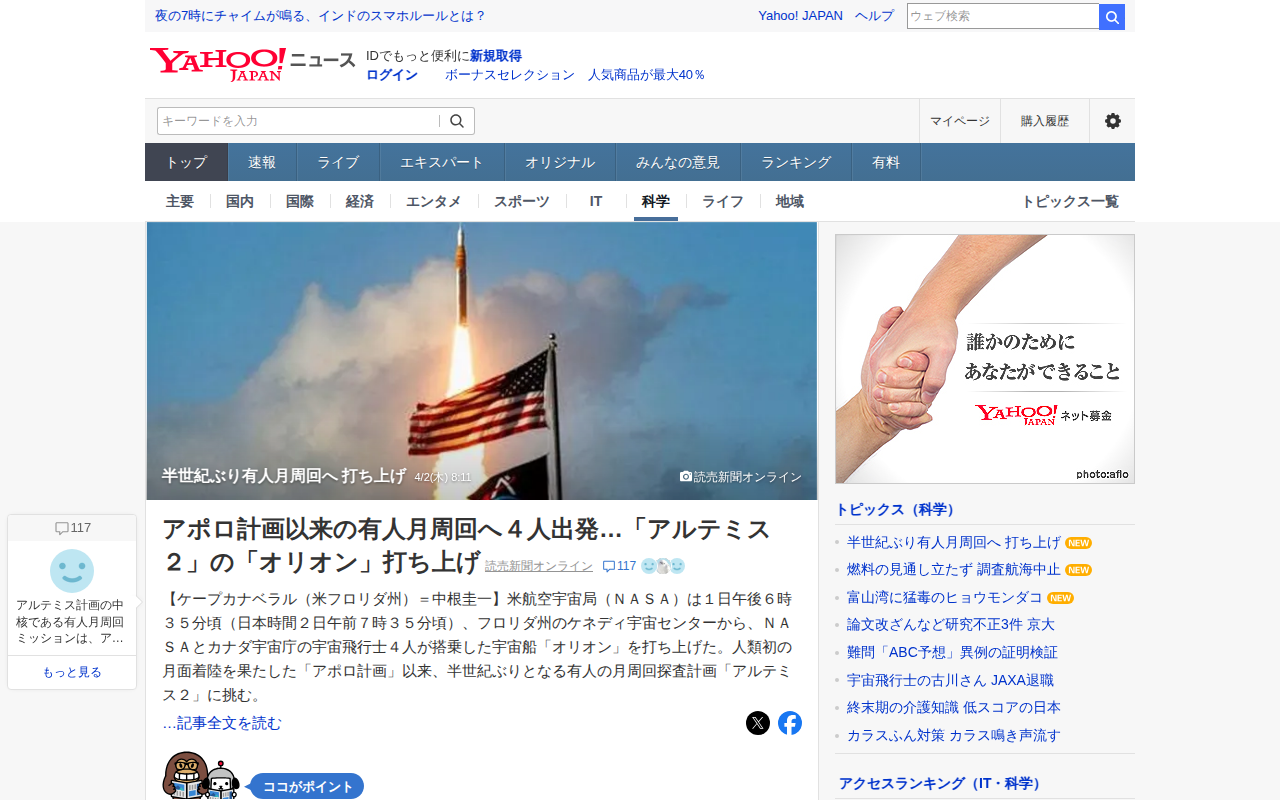 半世紀ぶり有人月周回へ 打ち上げ - Yahoo!ニュース