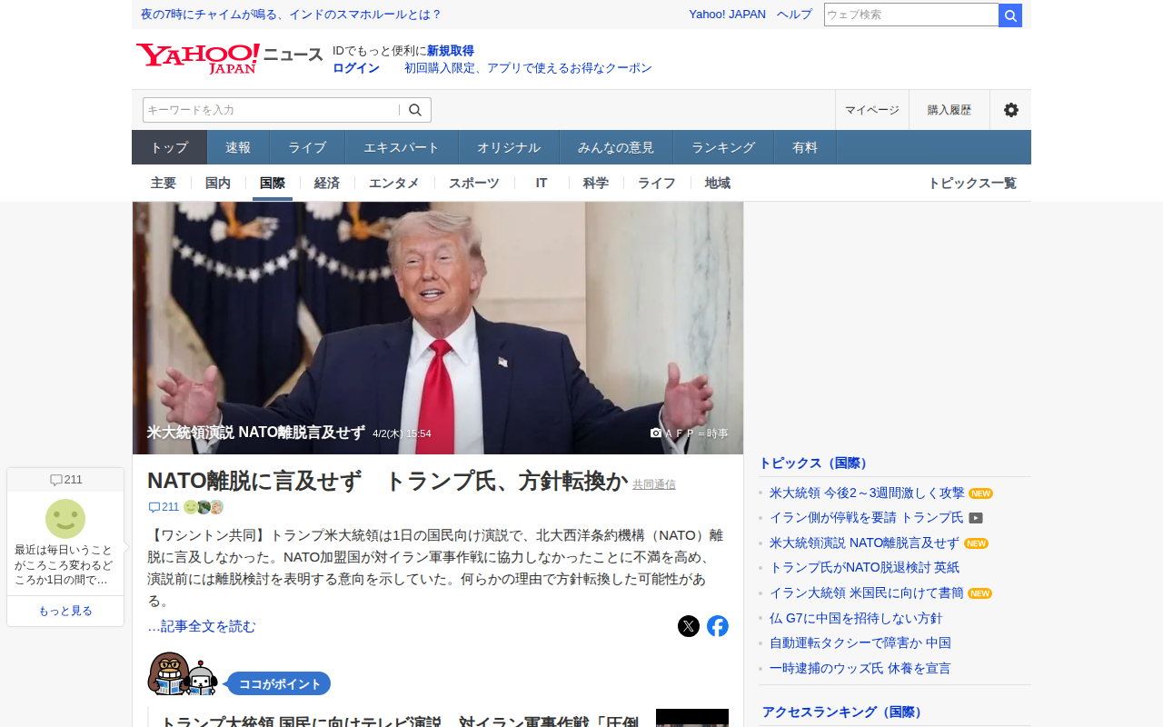 このページはトランプ米大統領の国民向け演説に関する報道である。大統領は1日の演説で、NATO加盟国がイラン軍事作戦に協力しなかったことへの不満を以前表明していたが、演説ではNATO離脱に言及しなかった。演説前は離脱検討を...