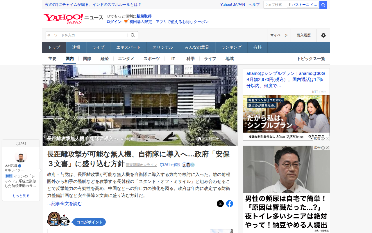 このページは、政府・与党が長距離攻撃が可能な無人機を自衛隊に導入する方向で検討を開始したことを報じています。スタンド・オフ・ミサイルと組み合わせることで反撃能力の有効性を高め、中国などへの抑止力強化を図る方針です。年内に...