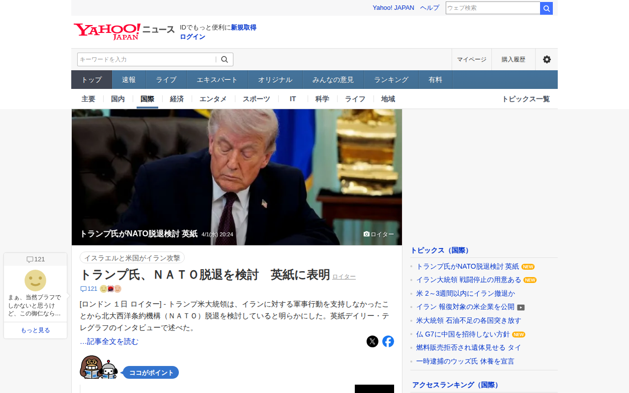 このページは、トランプ米大統領がNATO脱退を検討していることを報じるニュースである。トランプ氏は英紙デイリー・テレグラフのインタビューで、イランに対する軍事行動を支持しなかったことからNATO脱退を検討していると述べた...