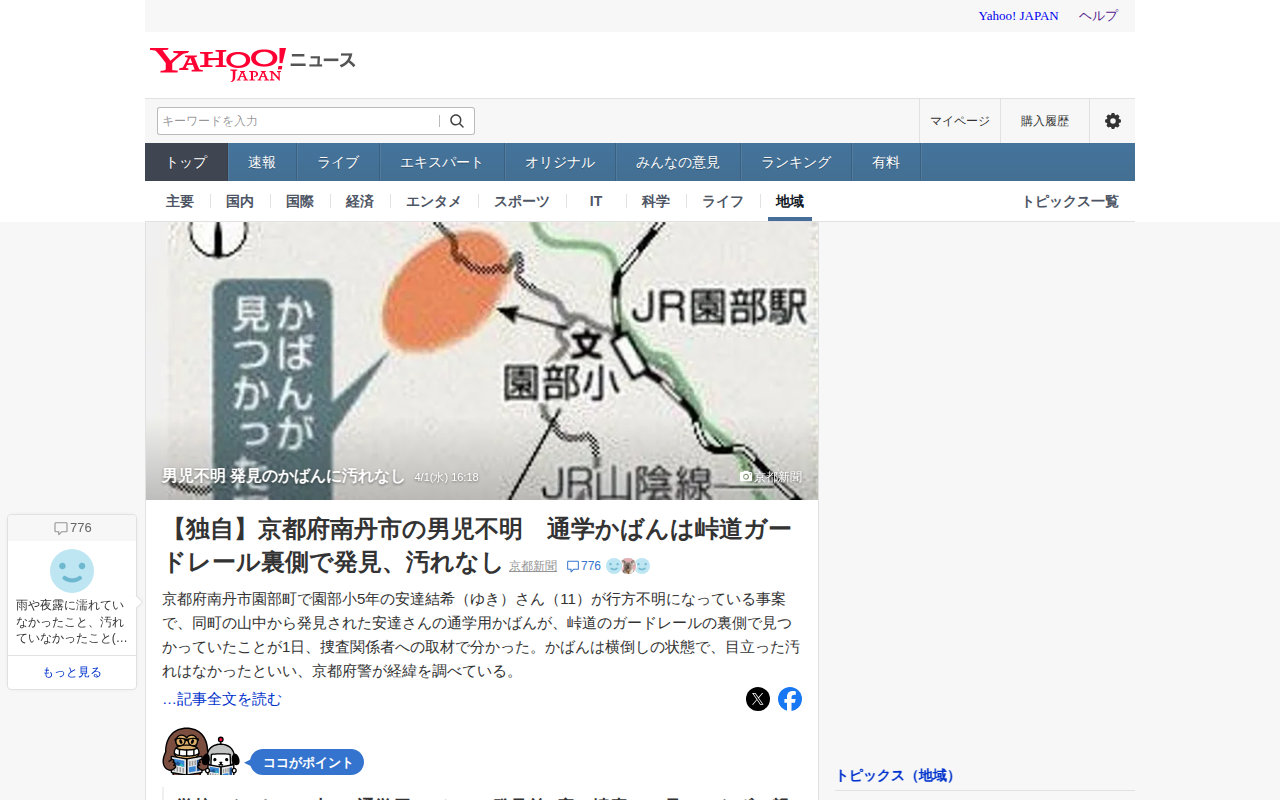 このページは、京都府南丹市で行方不明になっている小学5年生の安達結希さん(11歳)に関するニュースです。山中で発見された通学かばんが、峠道のガードレール裏側で横倒しの状態で見つかったことが報道されています。かばんに目立っ...